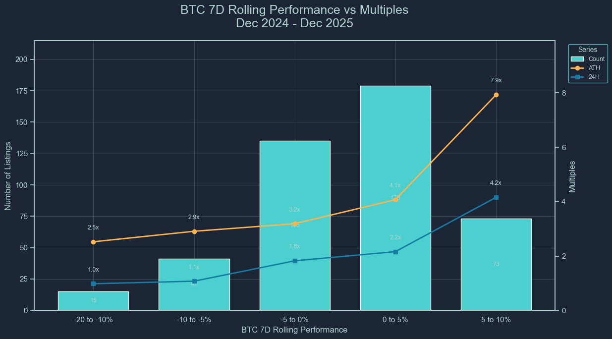 Beyond 0% BTC performance, however, the dynamic shifted. In the 0–5% bucket, listing activity peaked at 179 listings, yet performance expansion was moderate (ATH 4.1x, 24H 2.2x). The strongest outperformance appeared only in the 5-10% bucket, where ATH multiples surged to 7.9x and 24H to 4.2x, despite listings declining to 73.