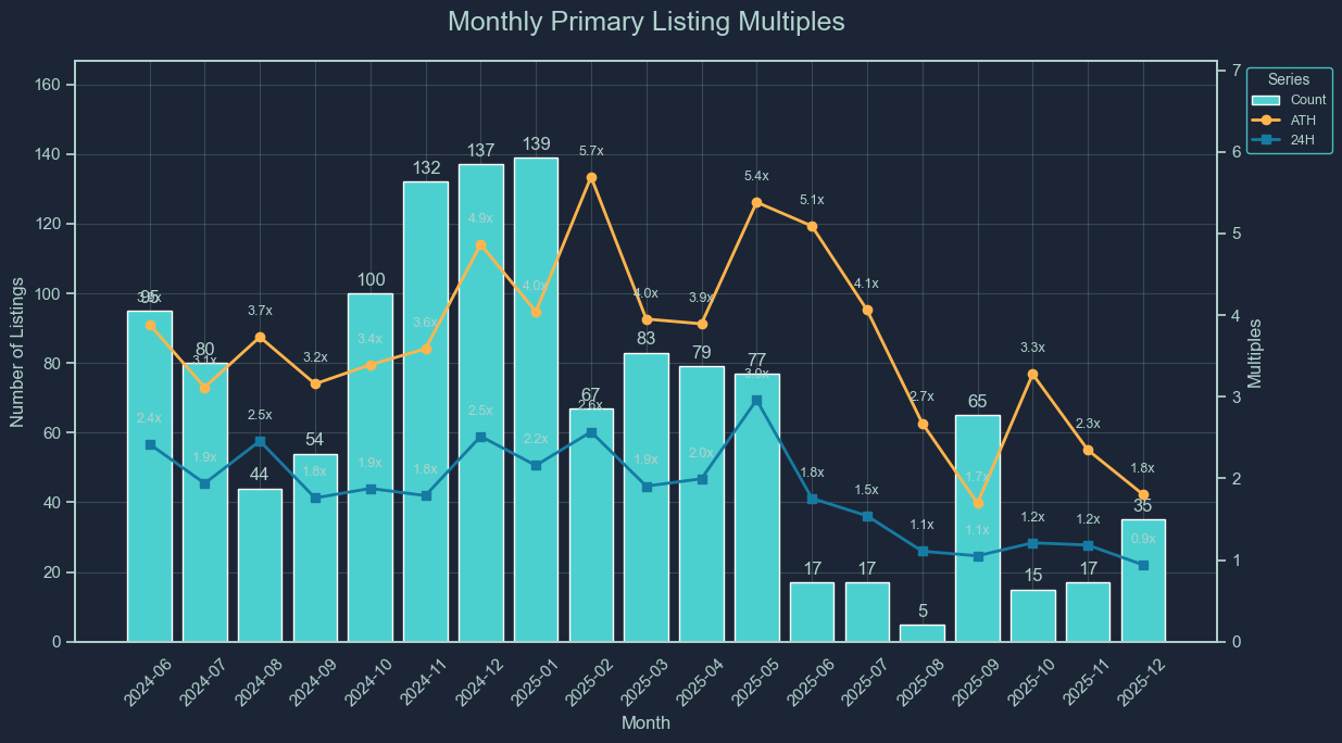 In early 2025, ATH multiples ranged between 4–5x but declined to 2.7x by August. Following 10/10, there was a brief recovery to 3.3x, but deterioration resumed, falling to 2.3x and then 1.8x by December, the lowest levels in our recorded time series. 24H multiples illustrate the structural breakdown even more clearly. These fell from 1.8-2.0x in June–July to approximately 1.1x in August and remained suppressed through year-end. The compression reflects declining risk appetite, lower external liquidity, and reduced speculative participation in new listings.