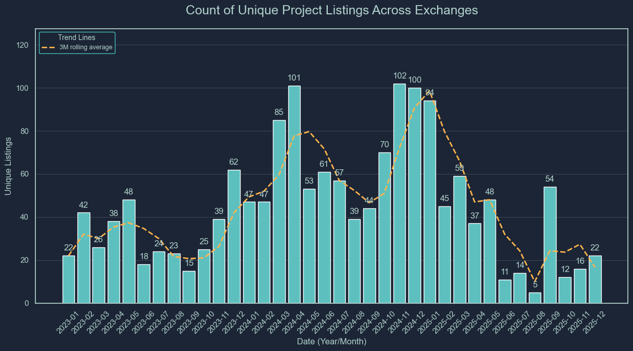 Over Half 2 (H2) 2025, the broader crypto market saw a contraction, which was directly seen by the reduction of primary listing volume seen on centralized exchanges (CEXs). Seasonal patterns observed in historical listing data of 2023 and 2024 broke in H2 highlighting a clear structural break in the market following the liquidation events of October 10, 2025 (10/10).