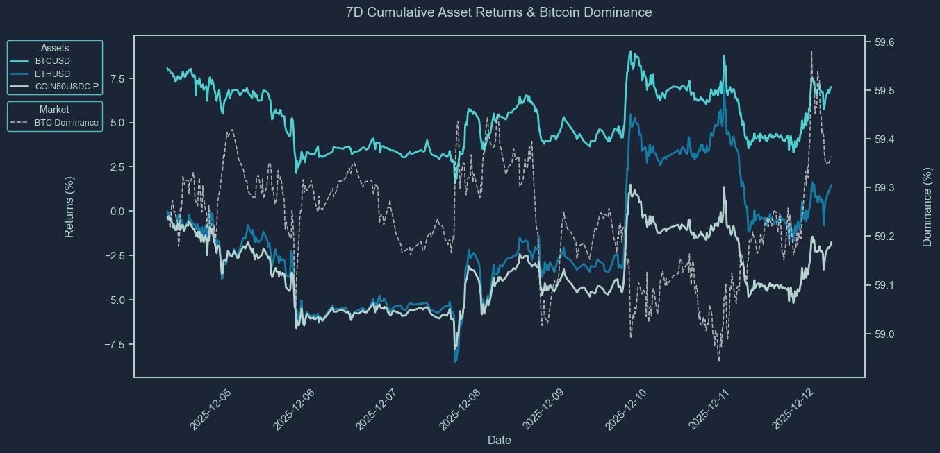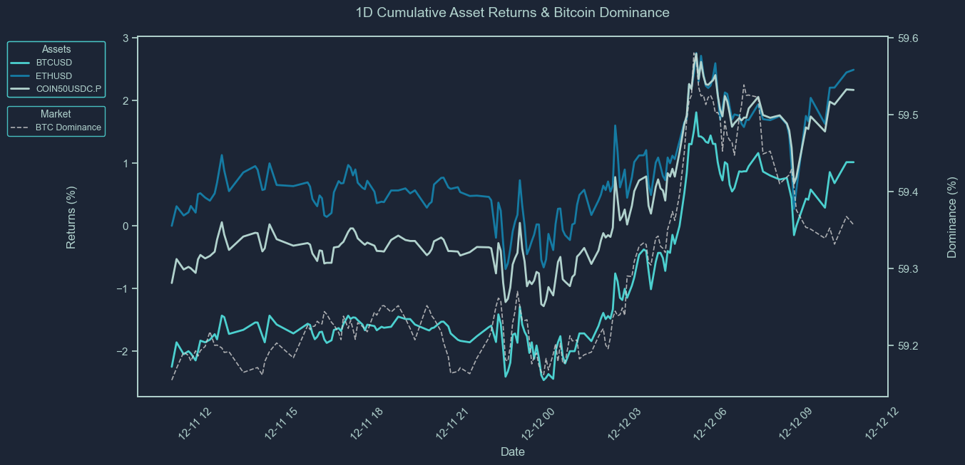 These charts show the cumulative price returns of Bitcoin (BTC), Ethereum ETH), and the COIN50 index over the selected periods; 30 days, 7 days or 24 hours. Returns are rebased to 0% at the start of each period to highlight relative performance trends between assets.