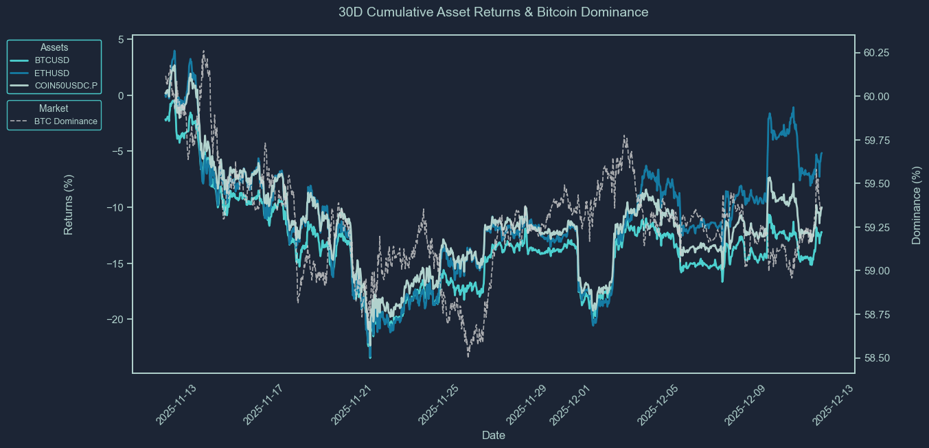 The BTC dominance line (secondary axis) tracks Bitcoin’s share of the total crypto market capitalization, offering context on capital rotation between BTC and altcoins. Rising BTC dominance typically indicates capital consolidation into Bitcoin, while a decline suggests increased risk appetite and flows into altcoins.