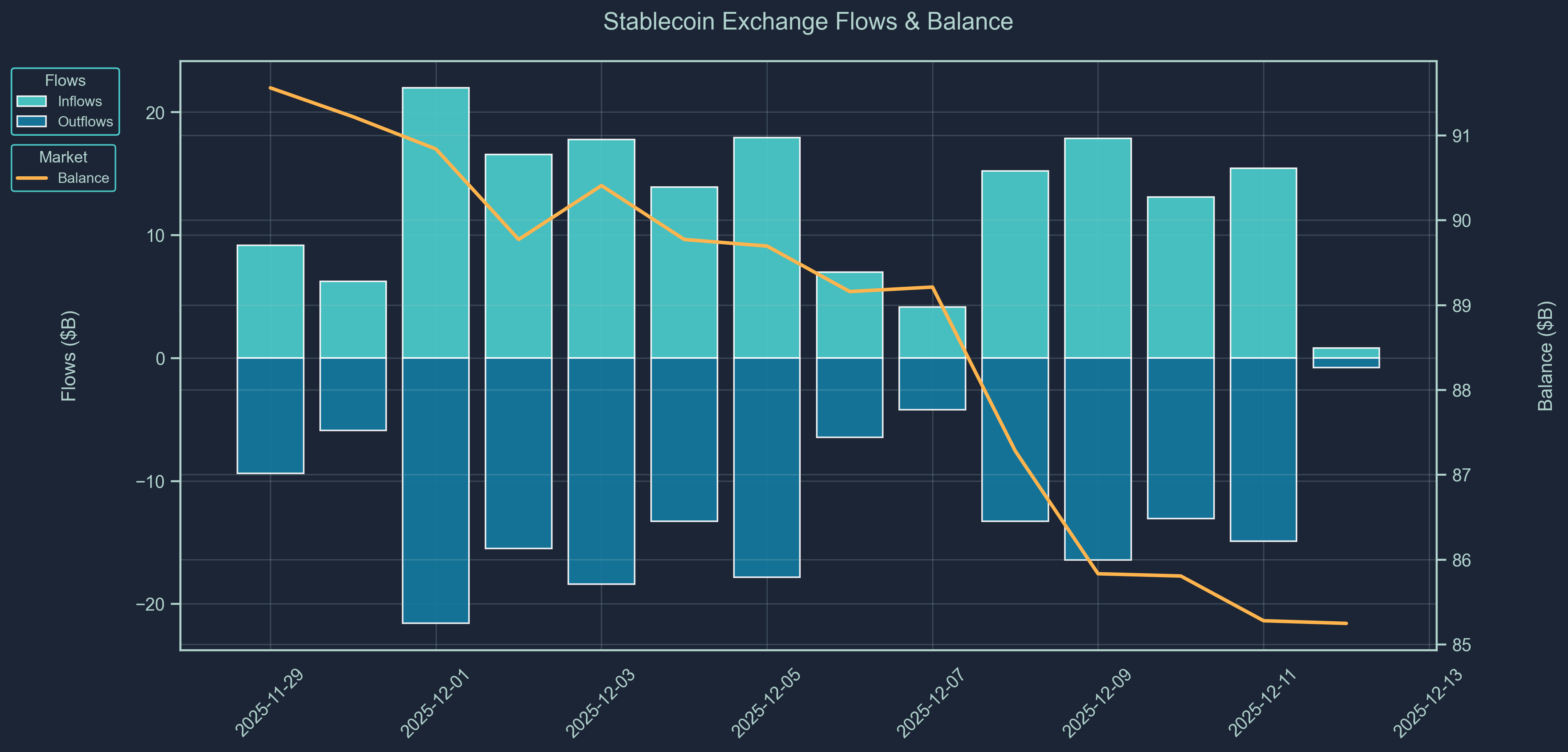 Overall positioning remains defensive, with stablecoin flows indicating sidelined liquidity awaiting clearer market direction despite improving structural and regulatory signals.