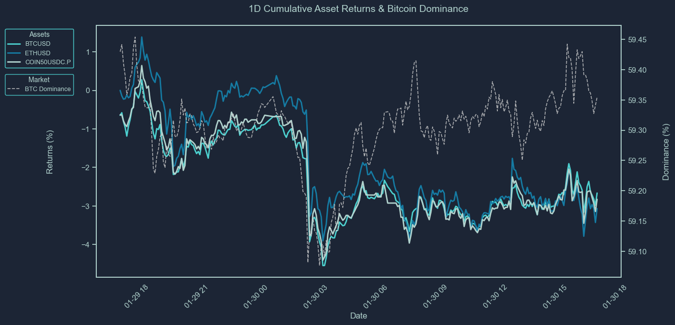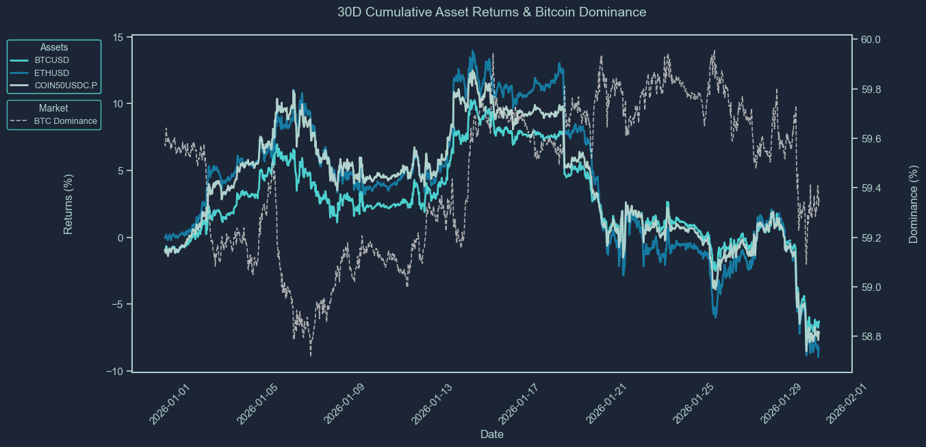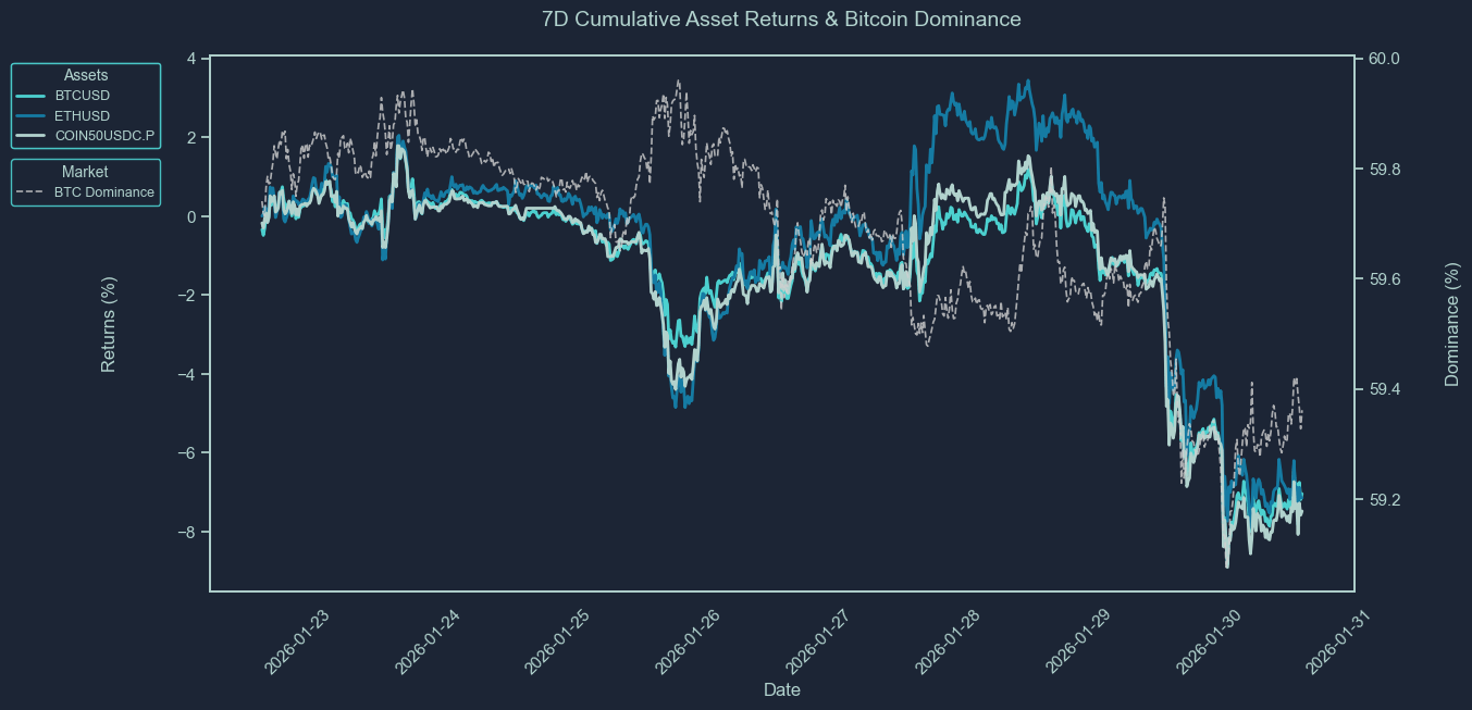 These charts show the cumulative price returns of Bitcoin (BTC), Ethereum ETH), and the COIN50 index over the selected periods; 30 days, 7 days or 24 hours. Returns are rebased to 0% at the start of each period to highlight relative performance trends between assets.