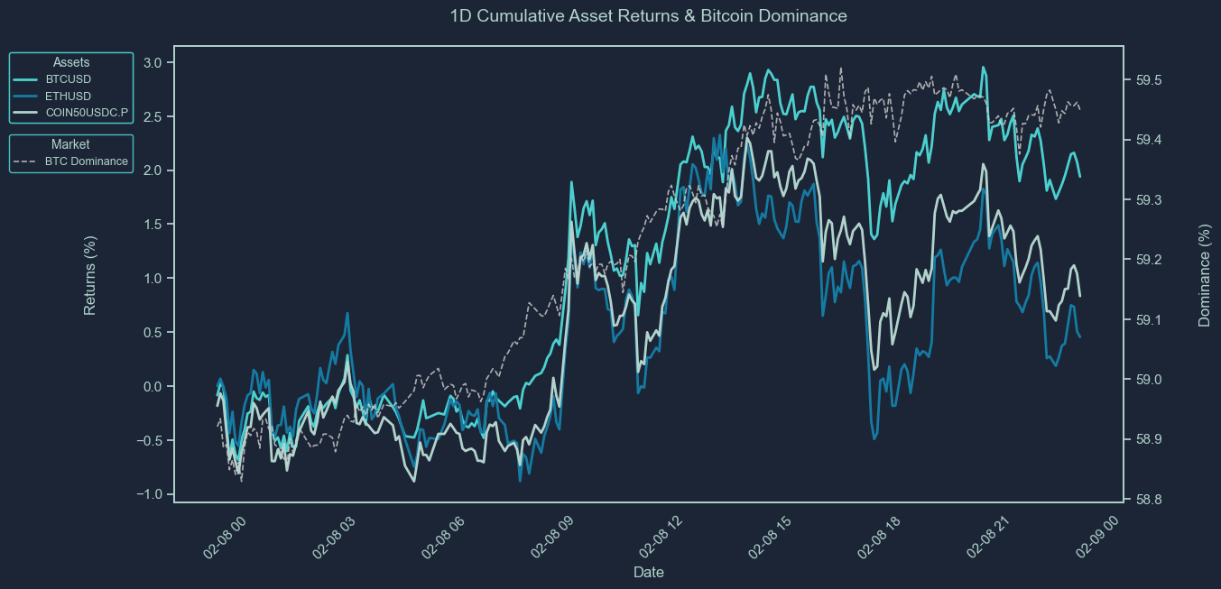 These charts show the cumulative price returns of Bitcoin (BTC), Ethereum ETH), and the COIN50 index over the selected periods; 30 days, 7 days or 24 hours. Returns are rebased to 0% at the start of each period to highlight relative performance trends between assets.
