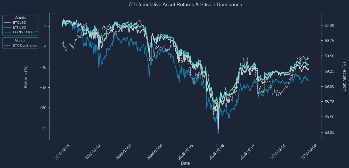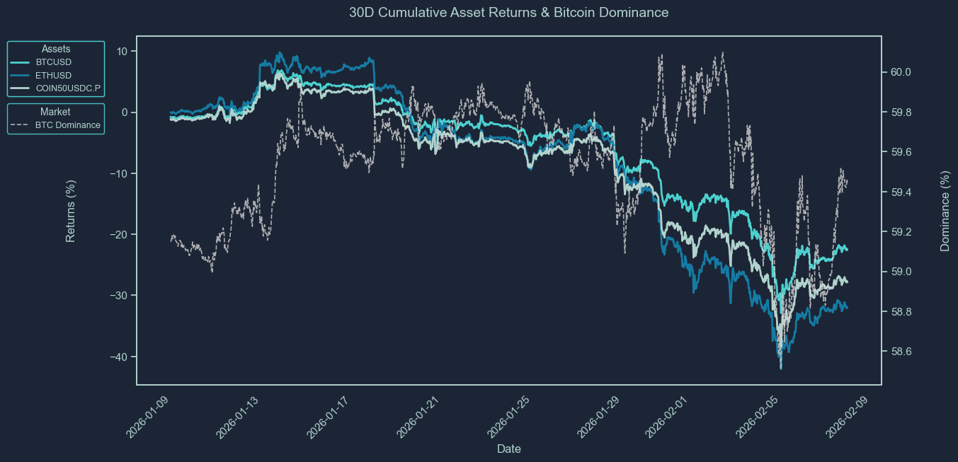 The BTC dominance line (secondary axis) tracks Bitcoin’s share of the total crypto market capitalization, offering context on capital rotation between BTC and altcoins. Rising BTC dominance typically indicates capital consolidation into Bitcoin, while a decline suggests increased risk appetite and flows into altcoins.