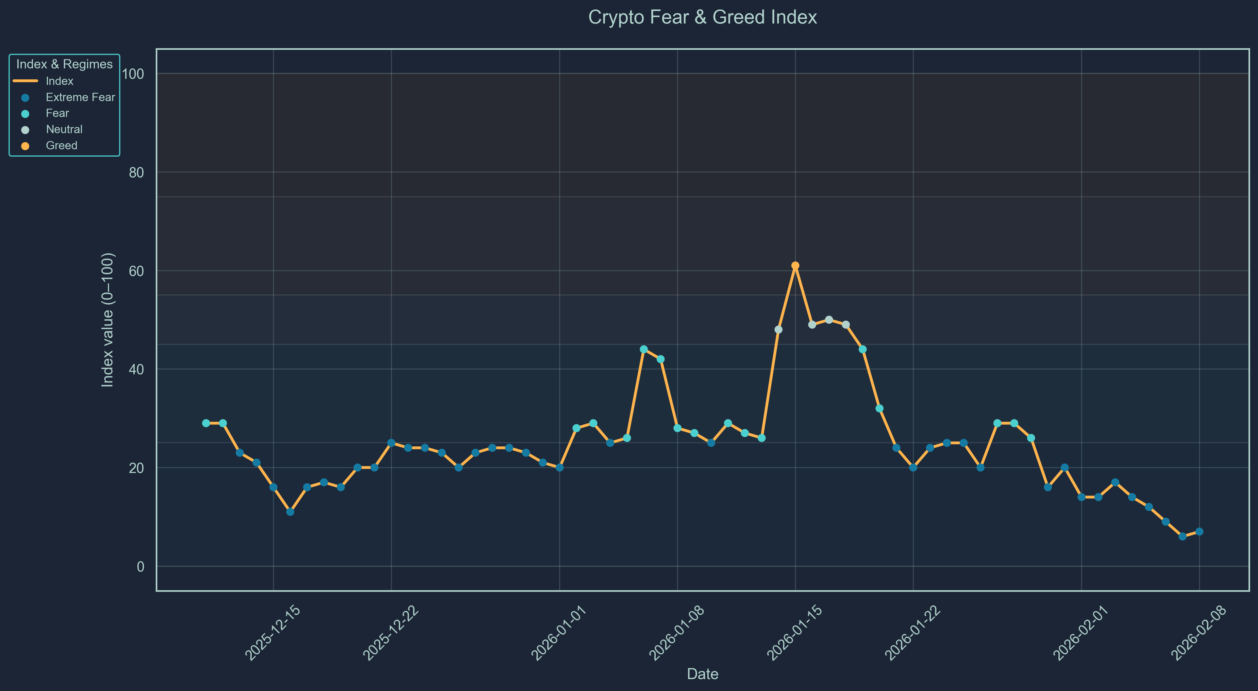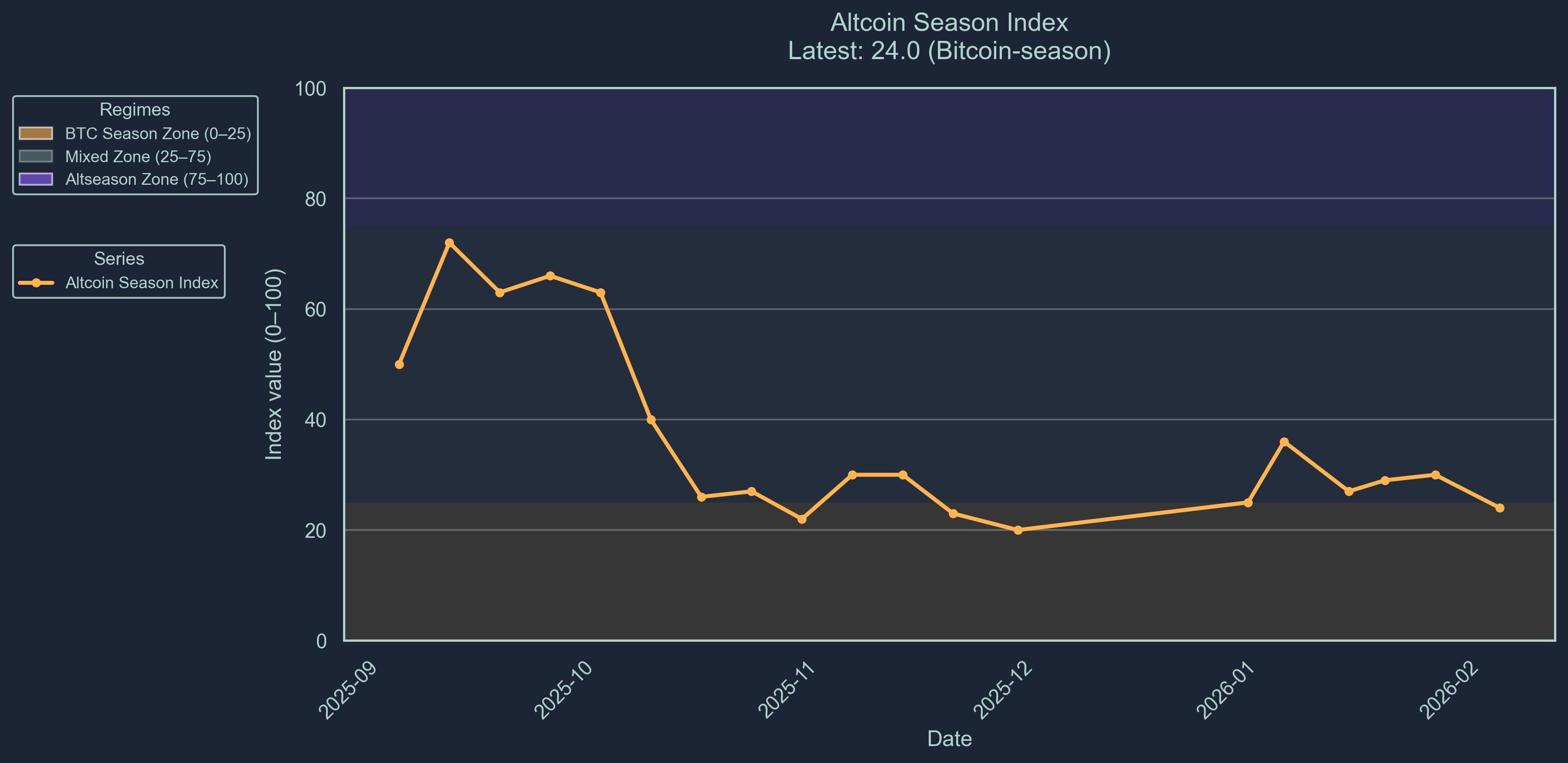 Market sentiment has collapsed into extreme fear. The Crypto Fear-and-Greed index sits at 7, reflecting capitulation-like conditions, while the altseason indicator at 24 confirms strong Bitcoin dominance and sustained altcoin underperformance.