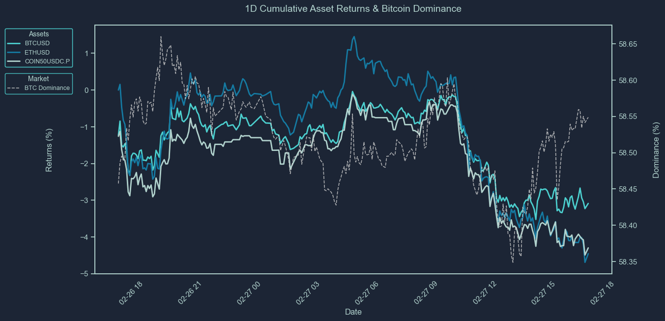 These charts show the cumulative price returns of Bitcoin (BTC), Ethereum ETH), and the COIN50 index over the selected periods; 30 days, 7 days or 24 hours. Returns are rebased to 0% at the start of each period to highlight relative performance trends between assets.