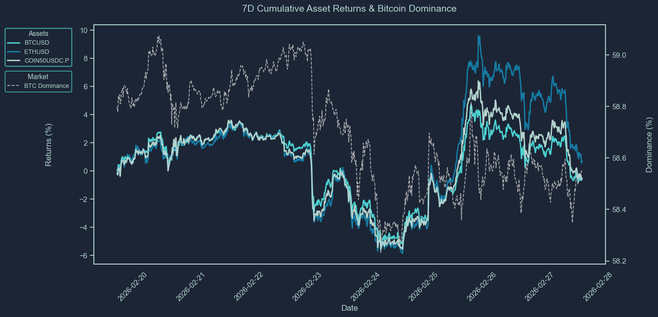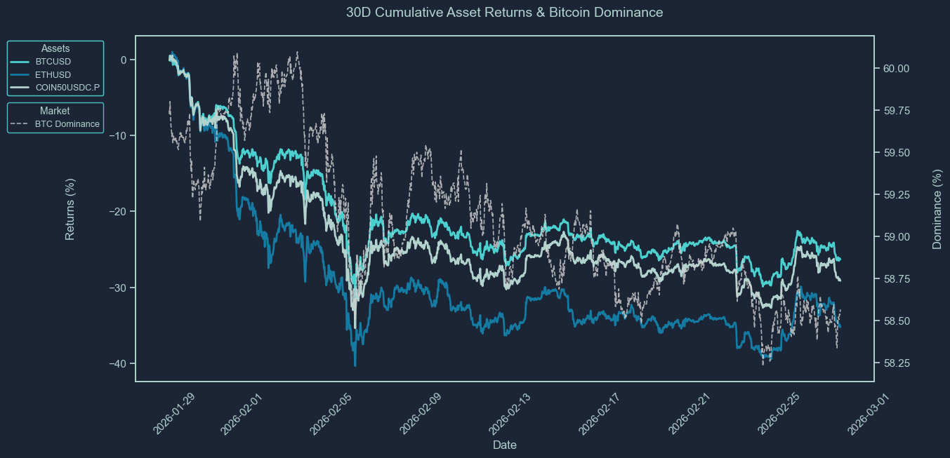 Price action remains weak across the asset class. Bitcoin trades near $66K, down over 26% on the month, while Ethereum has declined more than 35% to $1,940. Solana remains one of the weakest majors, down nearly 35%, and the broader COIN50 index has fallen roughly 29%, confirming persistent systemic weakness. In contrast, gold continues to show relative strength, reinforcing defensive capital rotation.