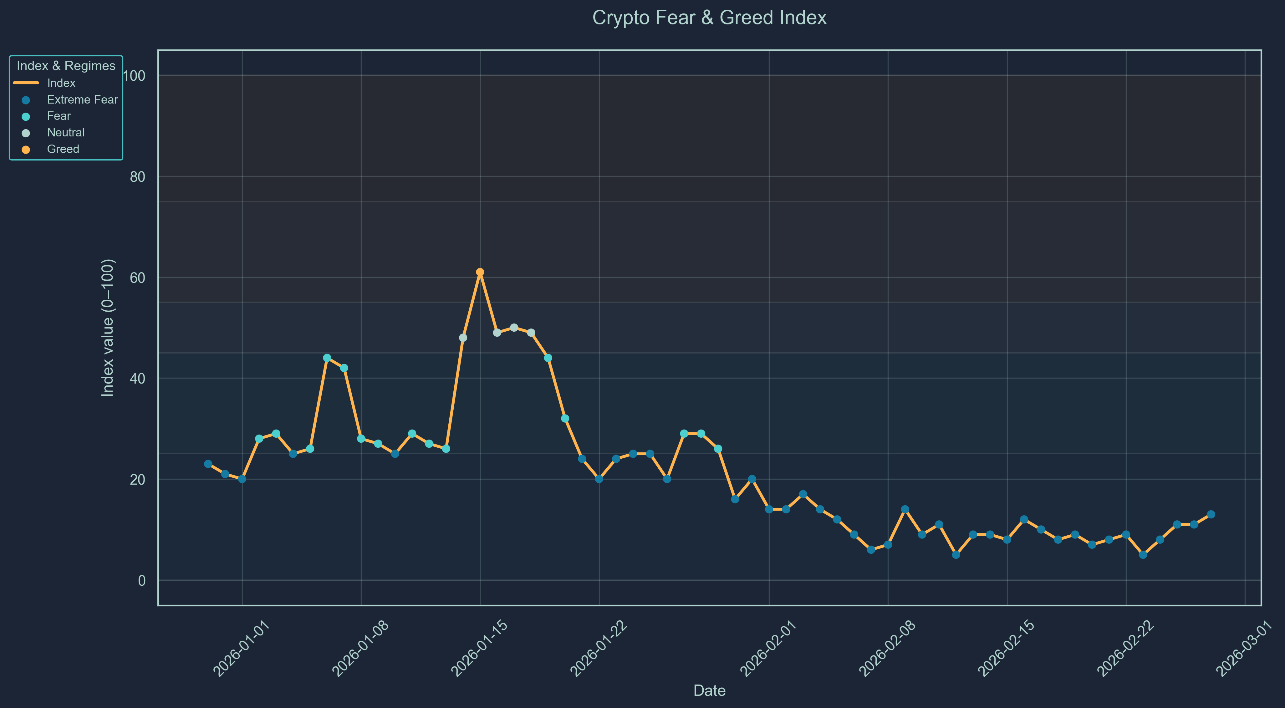 The crypto macro landscape remains under severe pressure as extreme risk-off sentiment persists across global markets. The Crypto Fear-and-Greed index sits at 13, reflecting continued capitulation conditions as macro uncertainty and liquidity tightening weigh heavily on risk assets. Regulatory developments added further complexity this week, with U.S. stablecoin oversight proposals casting uncertainty over issuer revenue models and potentially accelerating consolidation among compliant providers.