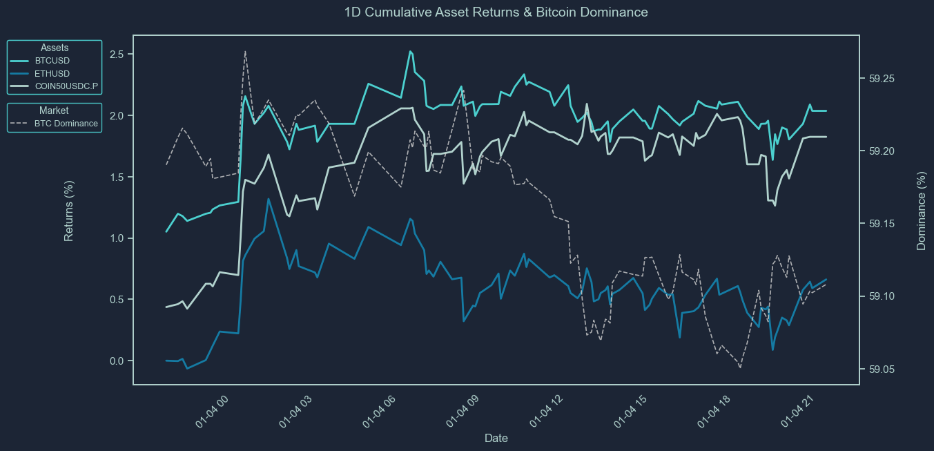 These charts show the cumulative price returns of Bitcoin (BTC), Ethereum ETH), and the COIN50 index over the selected periods; 30 days, 7 days or 24 hours. Returns are rebased to 0% at the start of each period to highlight relative performance trends between assets.