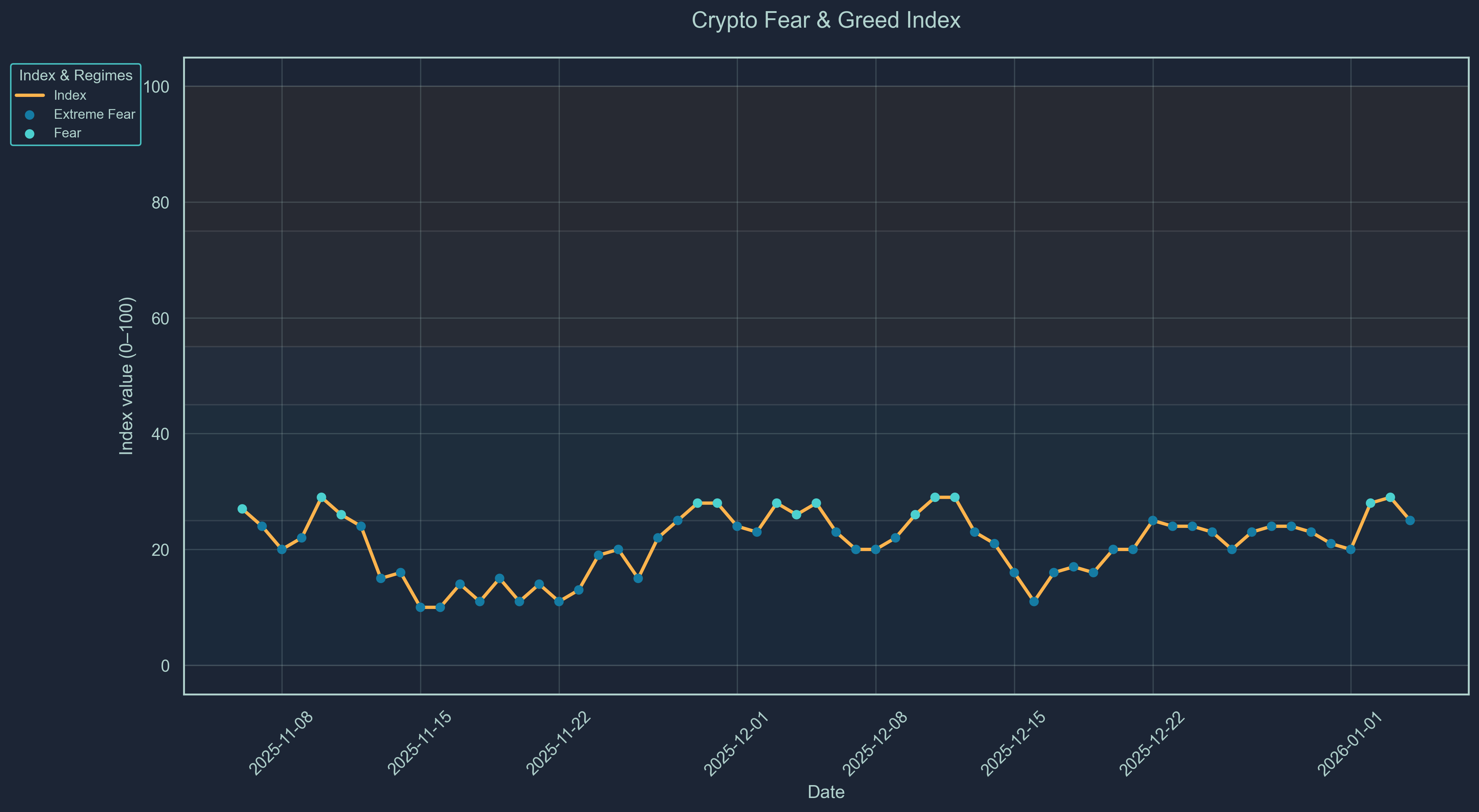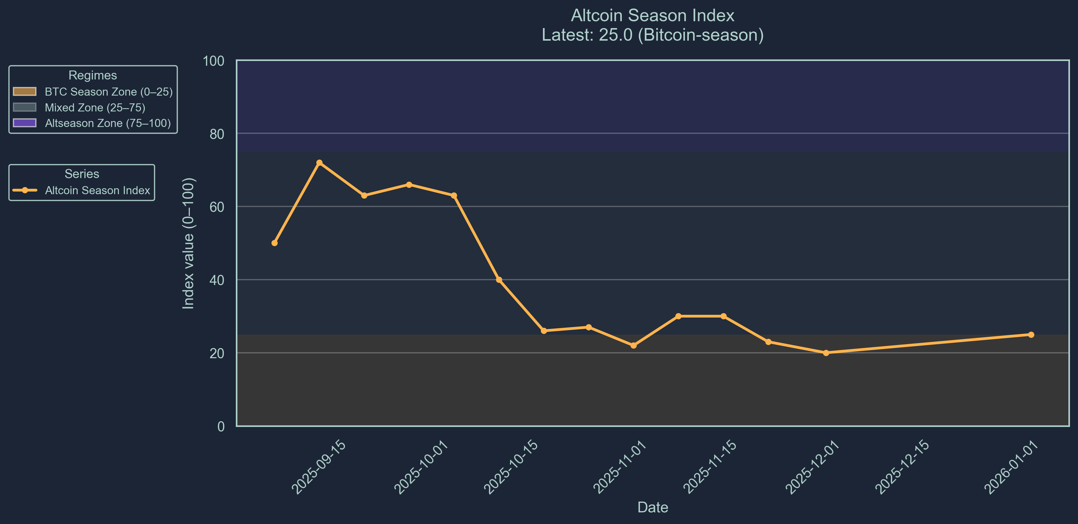 Market sentiment remains cautious but shows early signs of stabilization. The Crypto Fear-and-Greed index sits at 25, still in fear territory, while the altseason indicator has risen to 25, signaling a transition from Bitcoin season into a mixed regime at the start of the new year.