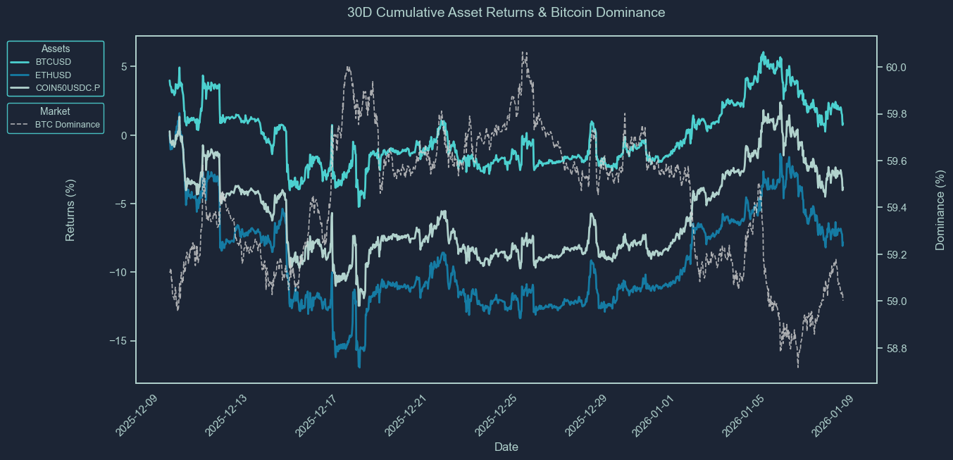 These charts show the cumulative price returns of Bitcoin (BTC), Ethereum ETH), and the COIN50 index over the selected periods; 30 days, 7 days or 24 hours. Returns are rebased to 0% at the start of each period to highlight relative performance trends between assets.