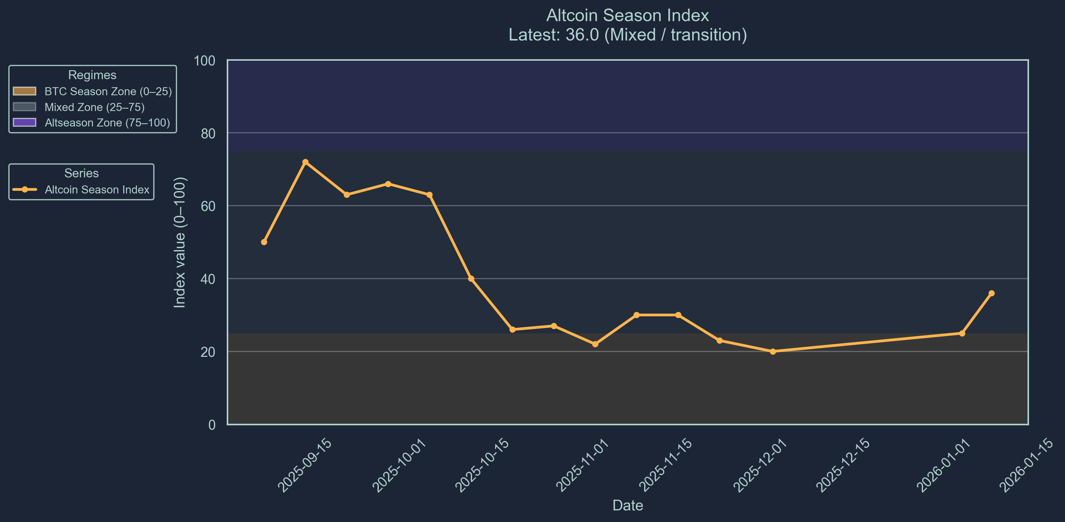 The altseason indicator is indicating a clear transition phase in the marker. While the market remains fearful, the new year brings optimism and regulatory tail wins to the market. The altseason indicator sits at 36.0 (Scale 0-100). This score represents that only 36% of altcoins included in the Top-100 index outperformed Bitcoin over the previous 90 days. Bitcoin season is interpreted as a bearish signal in the market. We are now entering the mixed zone, a positive sentiment for the new year.