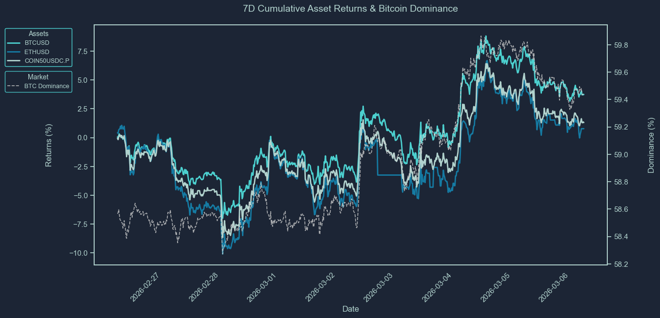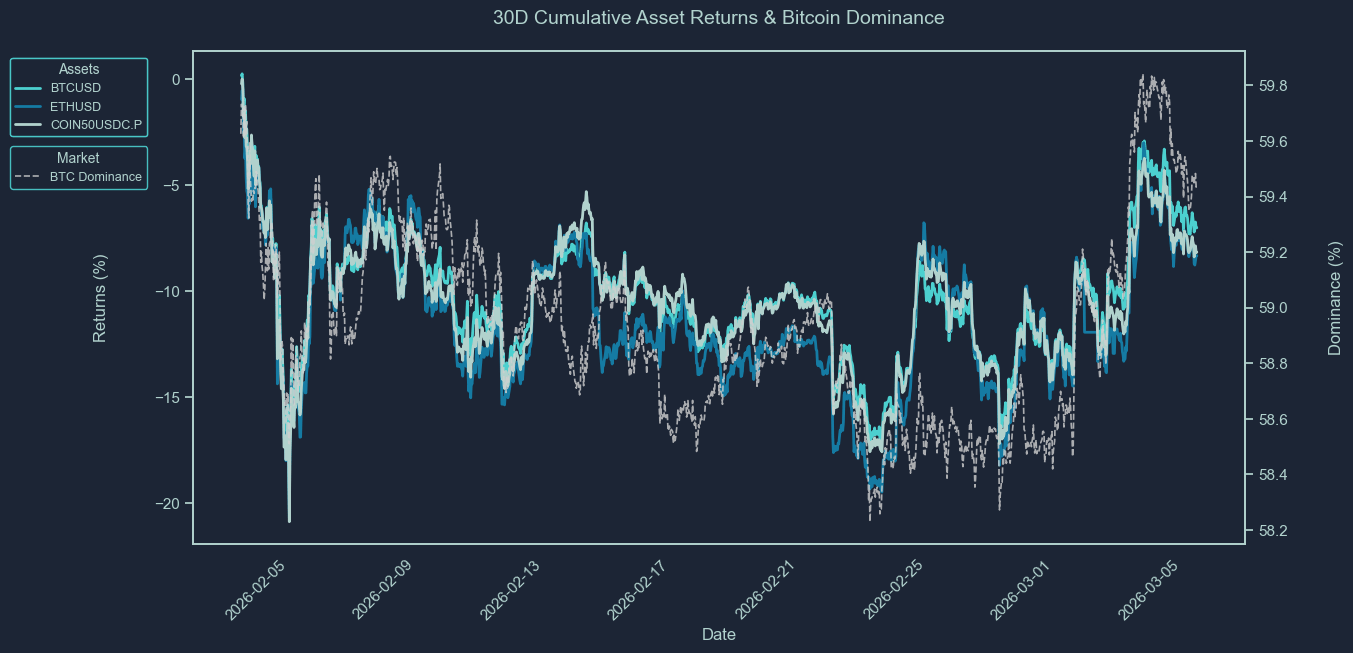 These charts show the cumulative price returns of Bitcoin (BTC), Ethereum ETH), and the COIN50 index over the selected periods; 30 days, 7 days or 24 hours. Returns are rebased to 0% at the start of each period to highlight relative performance trends between assets.