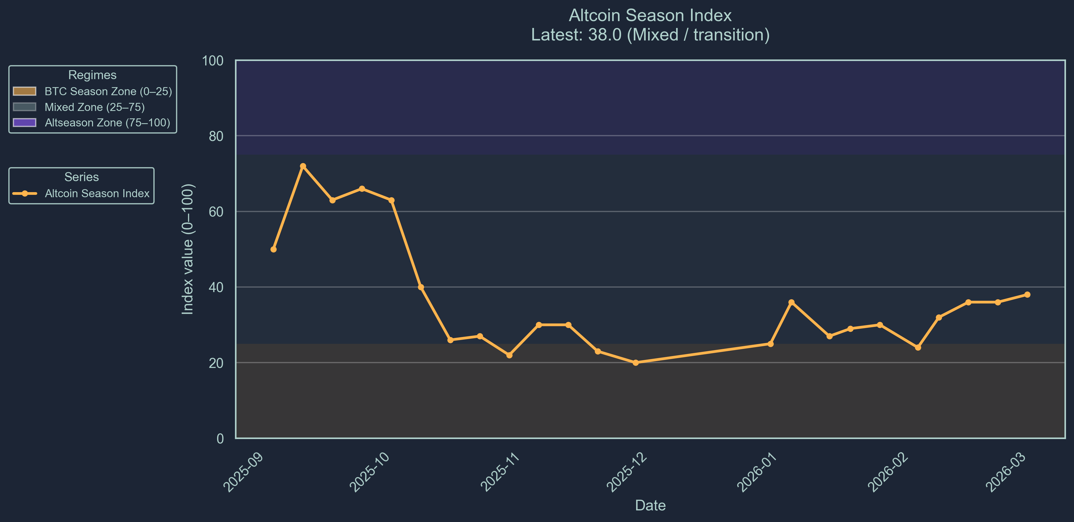 The altseason indicator is indicating a a Bitcoin biased transition season. The altseason indicator sits at 38.0 (Scale 0-100). This score represents that only 38% of altcoins included in the Top-100 index outperformed Bitcoin over the previous 90 days. Bitcoin season is interpreted as a bearish signal in the market. We are now entering the mixed zone, a positive sentiment for the new year.