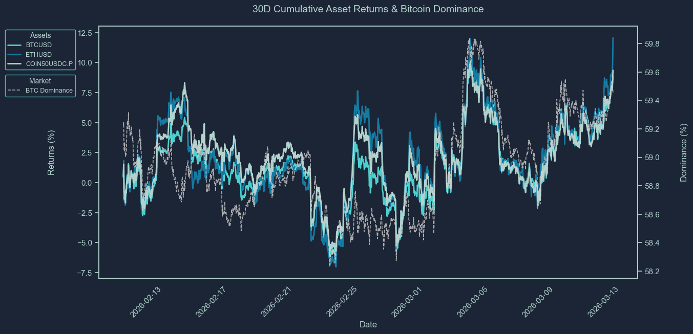 These charts show the cumulative price returns of Bitcoin (BTC), Ethereum ETH), and the COIN50 index over the selected periods; 30 days, 7 days or 24 hours. Returns are rebased to 0% at the start of each period to highlight relative performance trends between assets.
