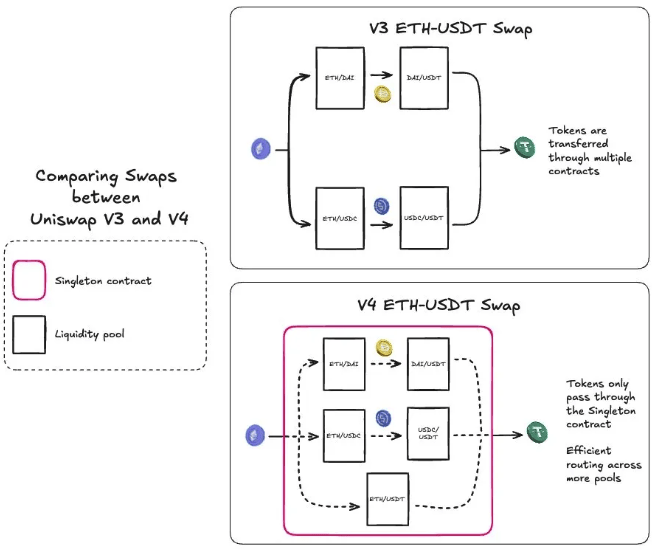 The singleton contract architecture has been implemented with native ETH support and adopting the ERC-6909 token standard for internal accounting. Liquidity provisioning and trading on v4 will be cheaper and more capital efficient.